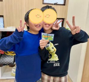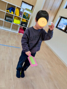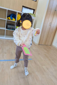 まずはカルタ遊び。反対言葉カードを使いペアで反対言葉を探しました。見事見つけるとニコニコ嬉しそうでした。