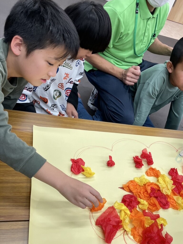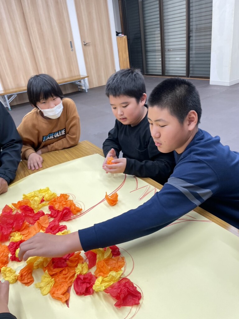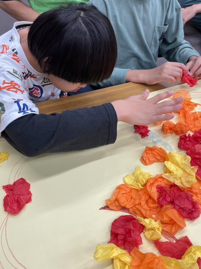 赤・オレンジ・黄色のお花紙を丸めてクシャクシャ。。