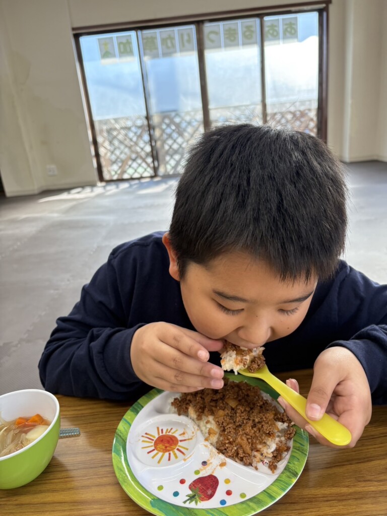 ご飯の時間になると、賑やかだった児童たちも黙々と食べていました♪