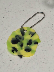 細かく砕いた色とりどりのペットボトルキャップのチップから好きな色を選んで、クッキングシートに描かれた丸からはみ出さないように置いていきます!そして順番にアイロンをかけていきます!そのあとは形が崩れないように床に置き、板を押し当て、そのあたたかく熱が伝わる板の上に座って待ちます!そして、熱が冷めてきたら、クッキングシートを綺麗に剥がして完成です✨ある程度冷めたら、穴あけパンチで穴をあけてボールチェーンでキーホルダーにしました👏